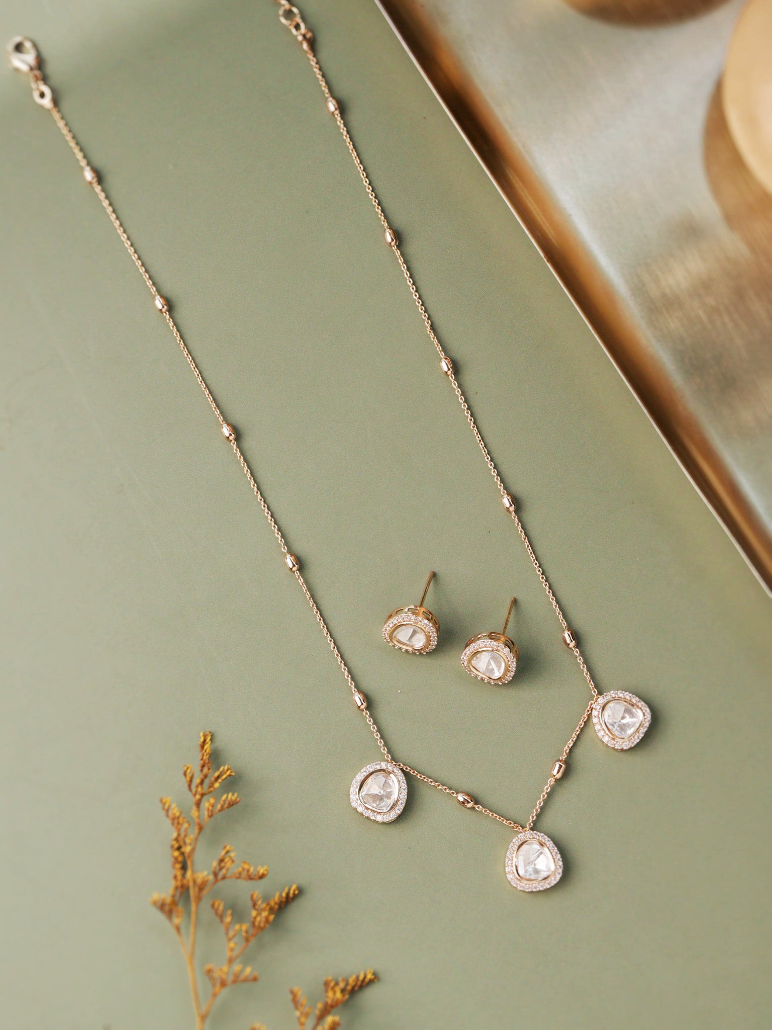 The Meiraa Droplets of Polki Necklace Set features a refined, contemporary design with carefully set Polki stones. Its subtle droplet motif offers a clean and elegant look, perfect for adding a modern touch to traditional attire.