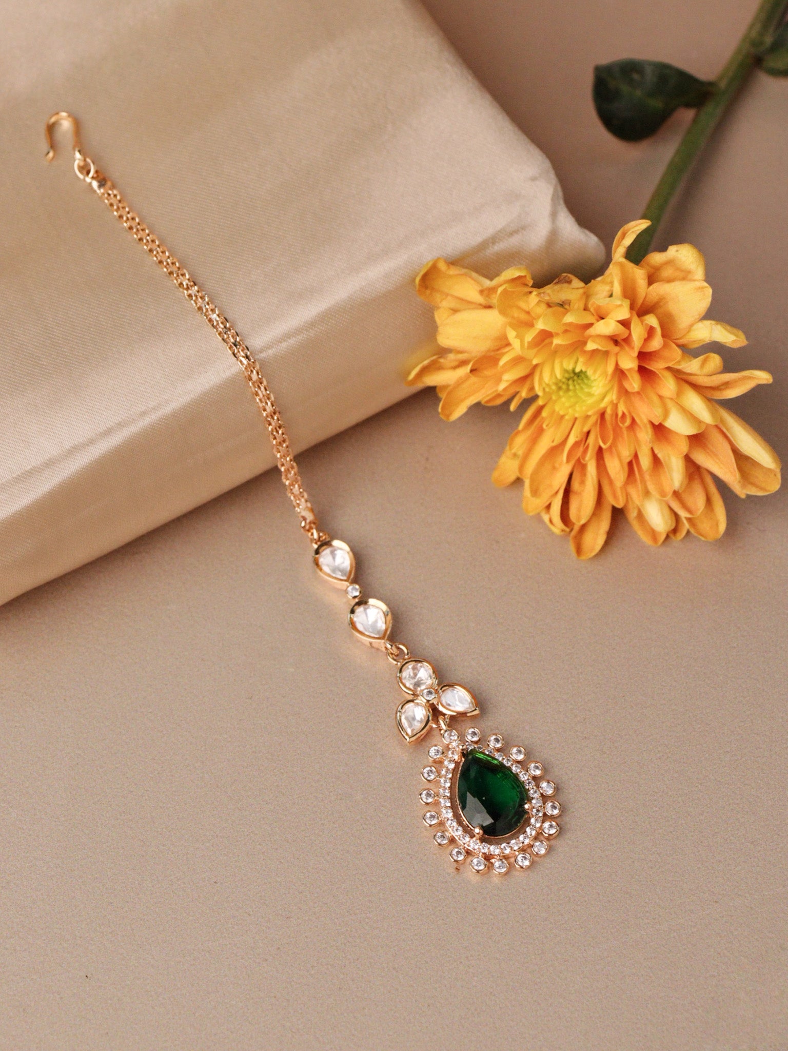 The Meiraa Emerald Drop Maang Tikka presents an elegant design featuring a captivating emerald green drop. This refined piece adds a touch of grace and spark of emerald to your collection.