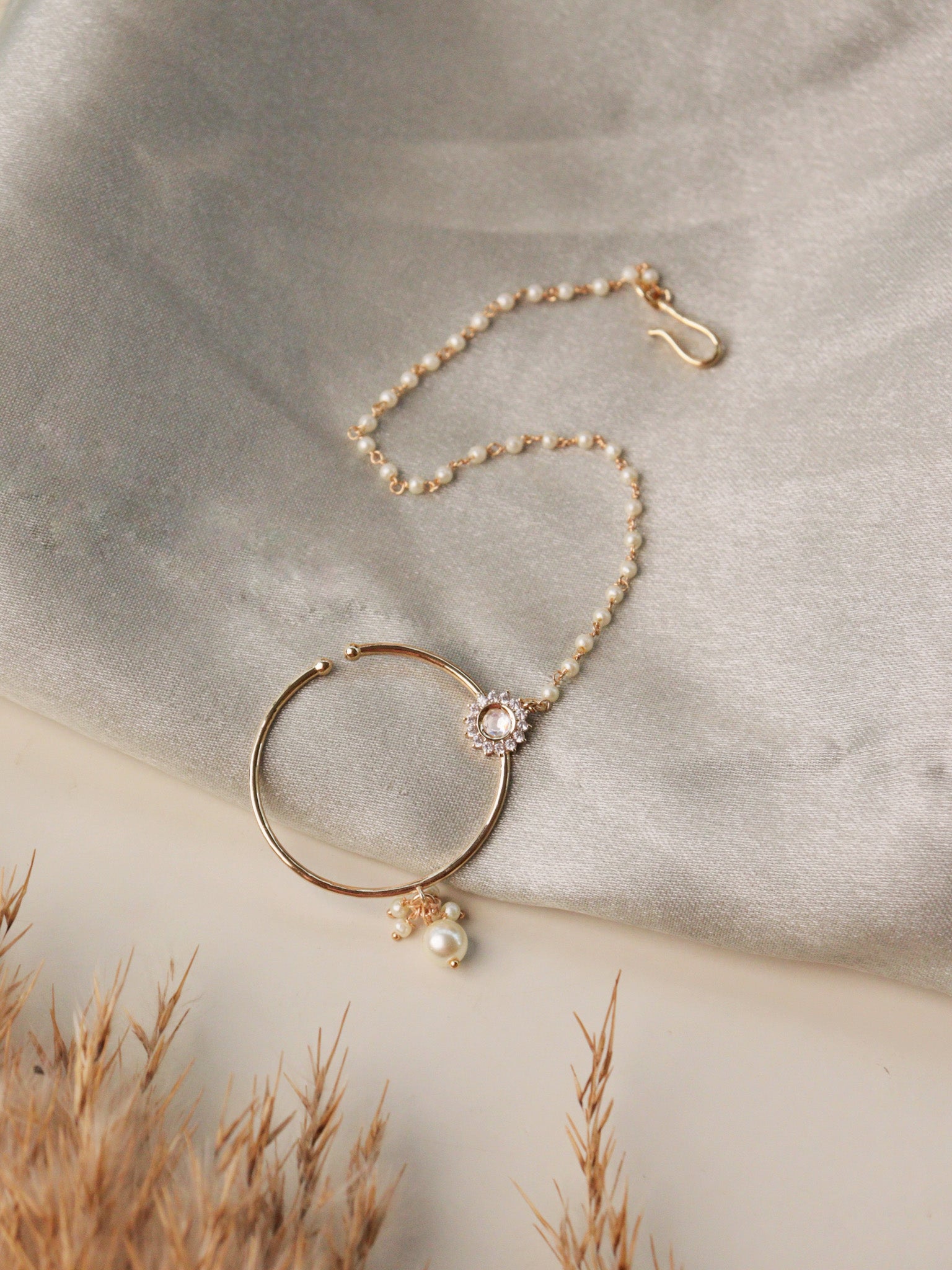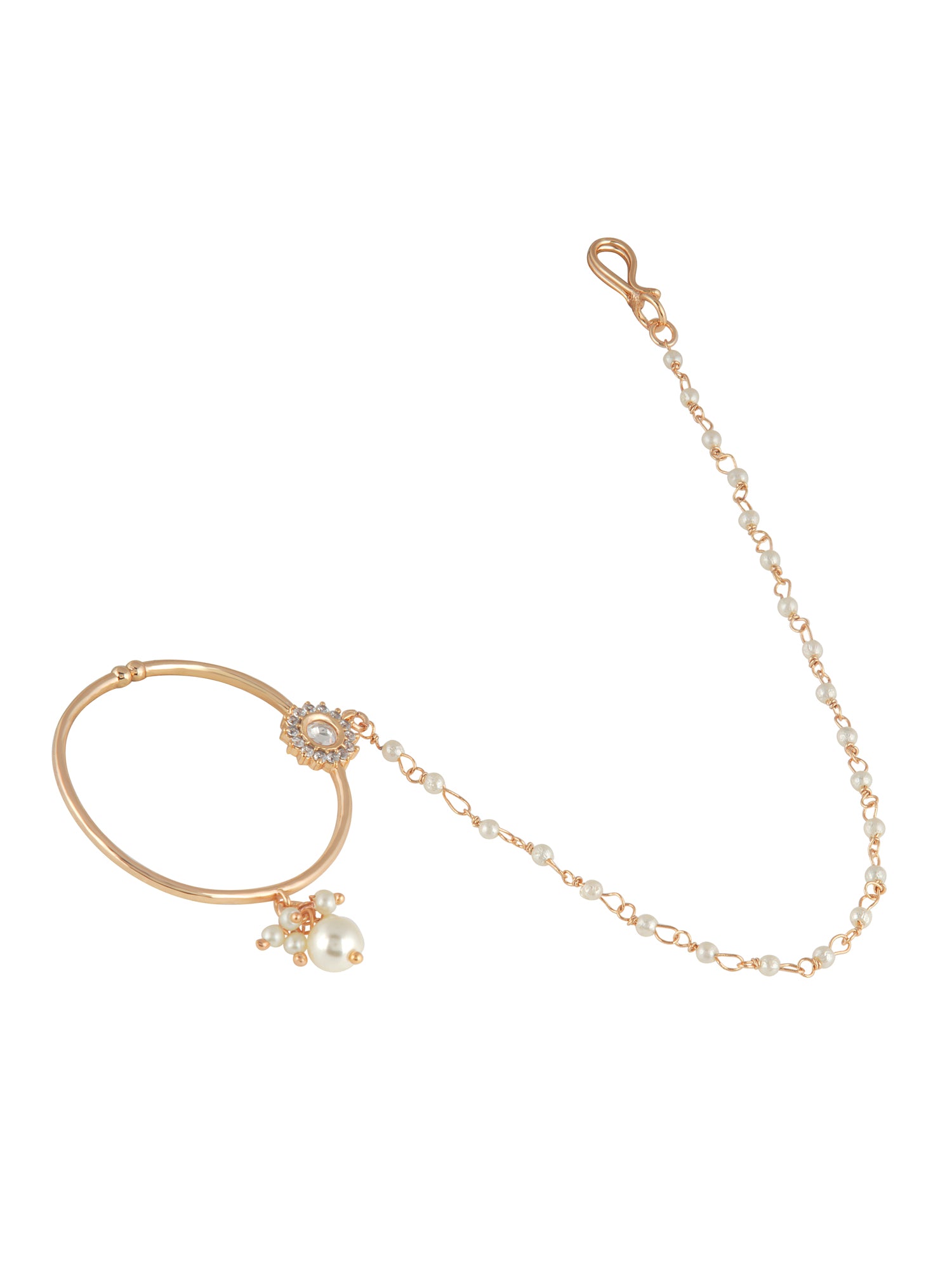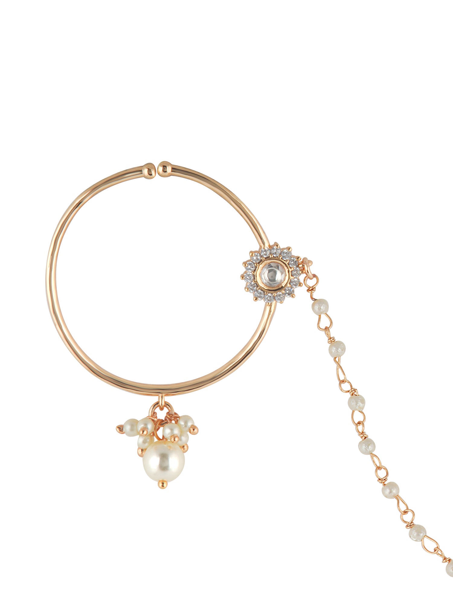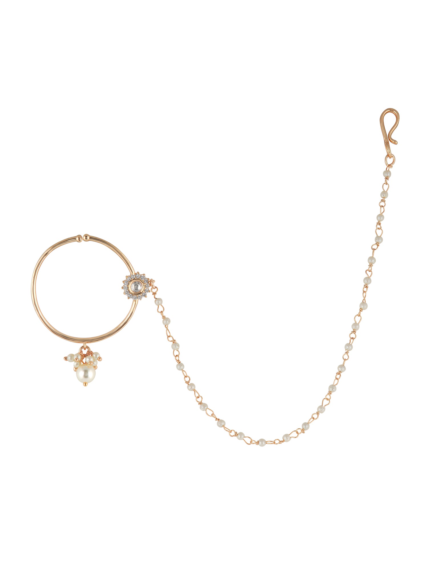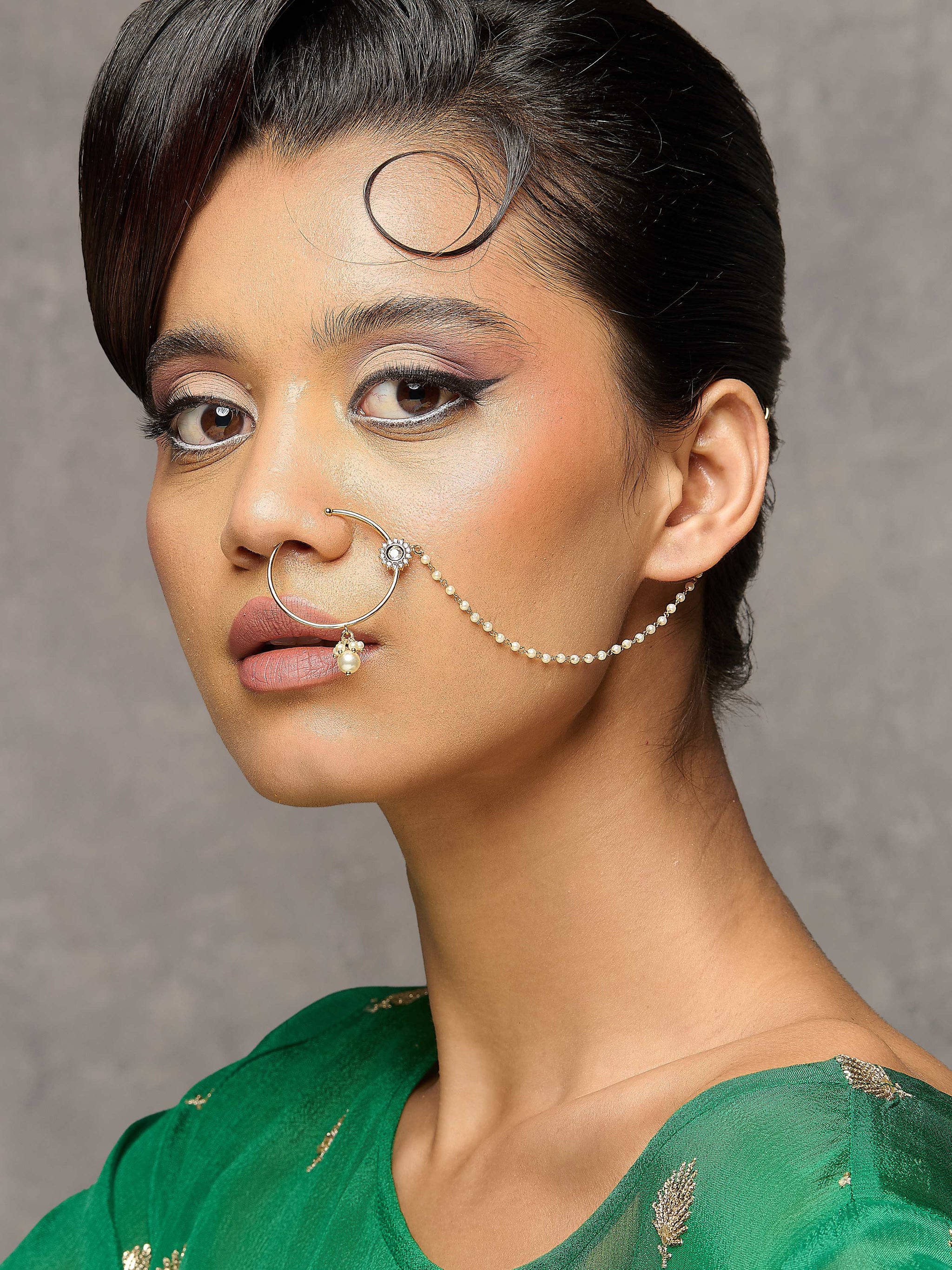 The Meiraa Spark of Kundan Nath showcases a refined kundan design accented with shimmering CZ stones. This elegant piece blends traditional ethnic craftsmanship with sophisticated style, adding a graceful sparkle to your look.
