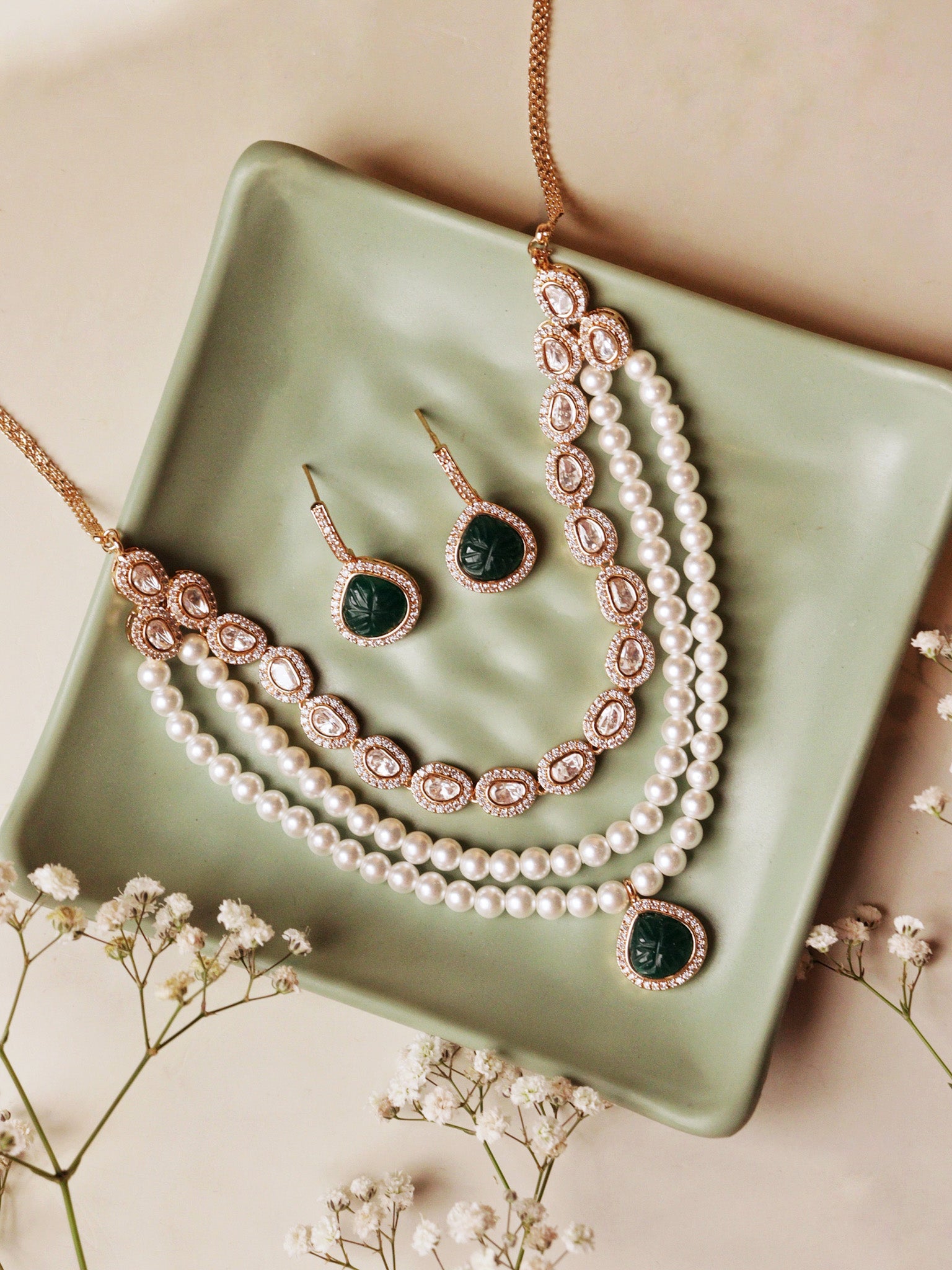 A stunning blend of glamour and tradition, this set features two layers of lustrous pearls, one layer of sparkling polki stones, and a striking green carved stone pendant. Perfect for adding a regal touch to any outfit.