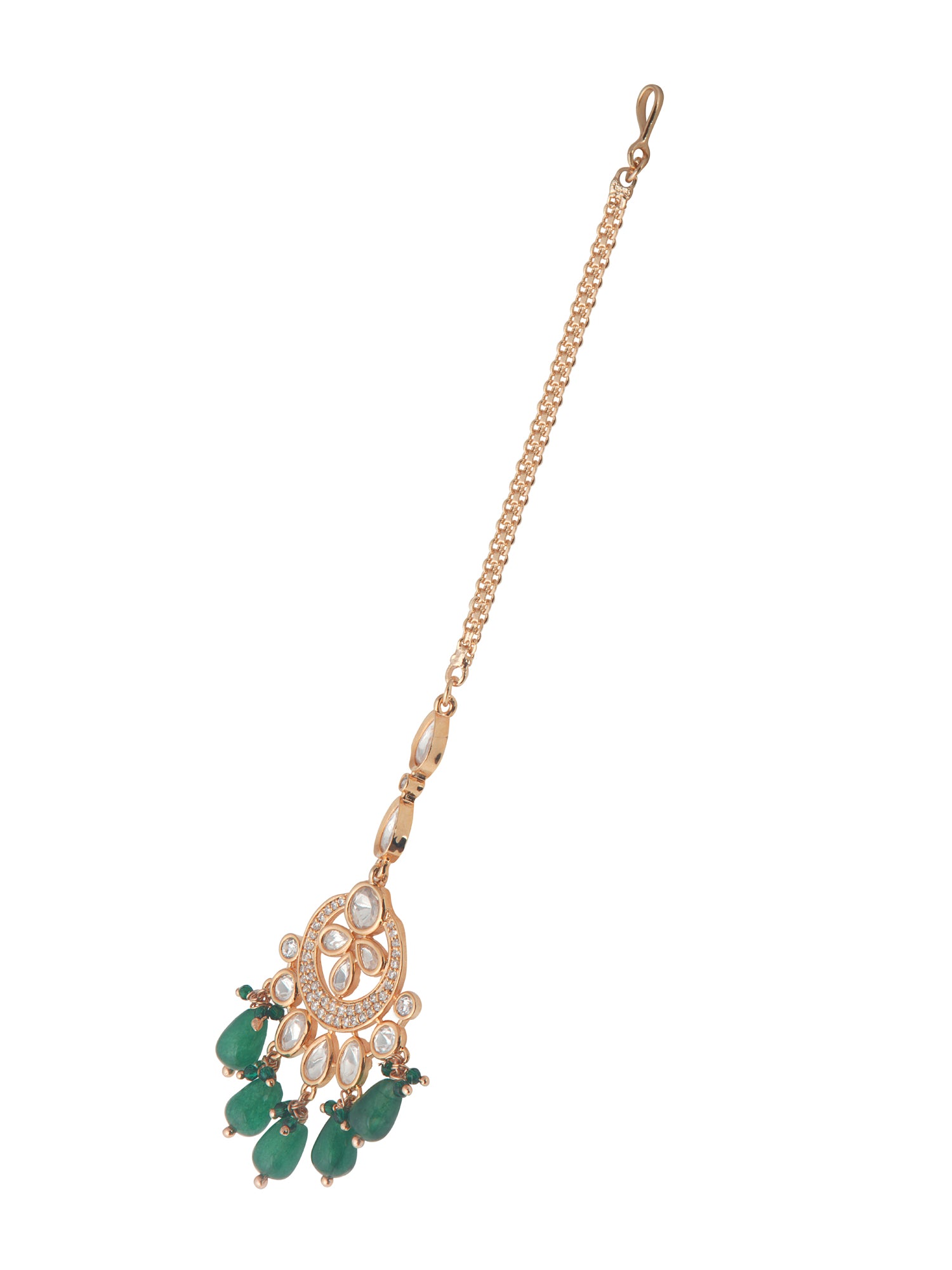 The Meiraa Crescent Green Maang Tikka features a beautiful crescent moon design adorned with vibrant green accents and intricate detailing. This elegant piece combines traditional artistry with a fresh pop of color, making it a stunning addition to any festive or bridal look.