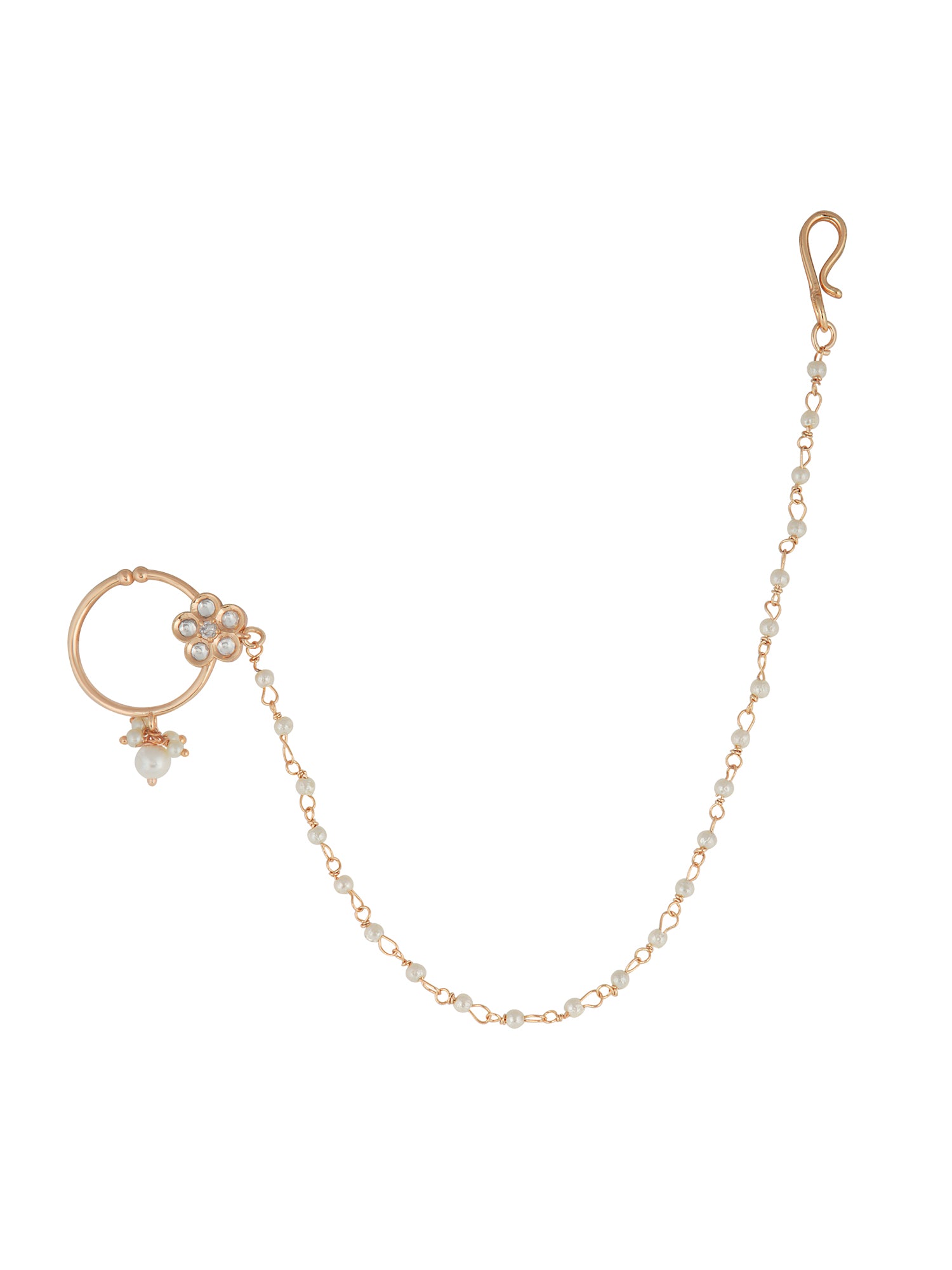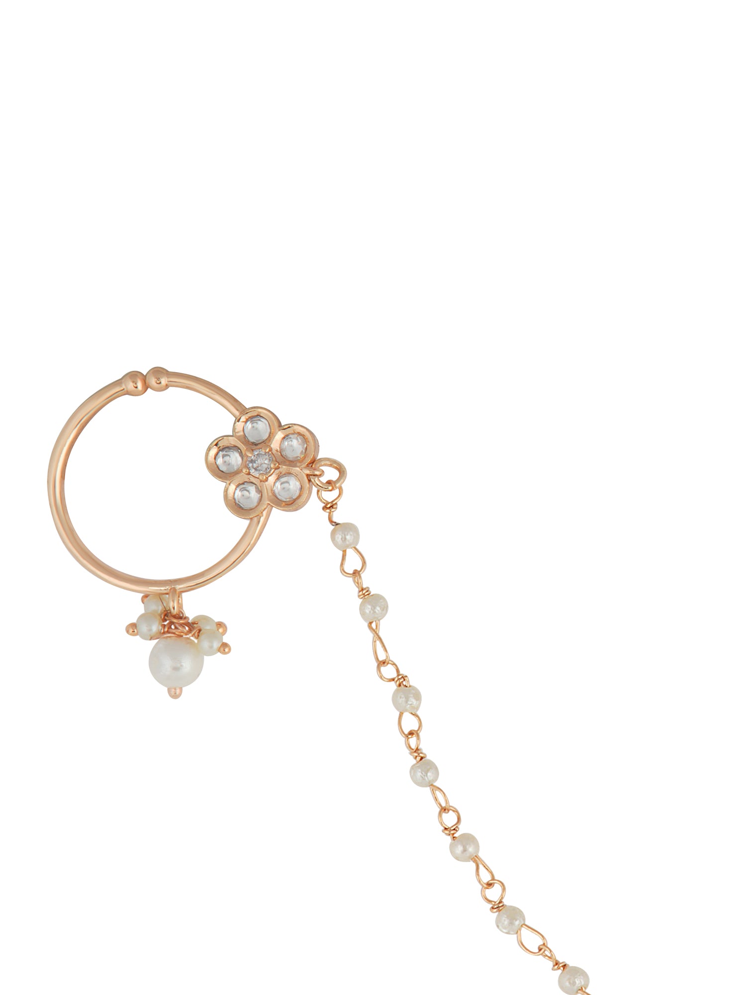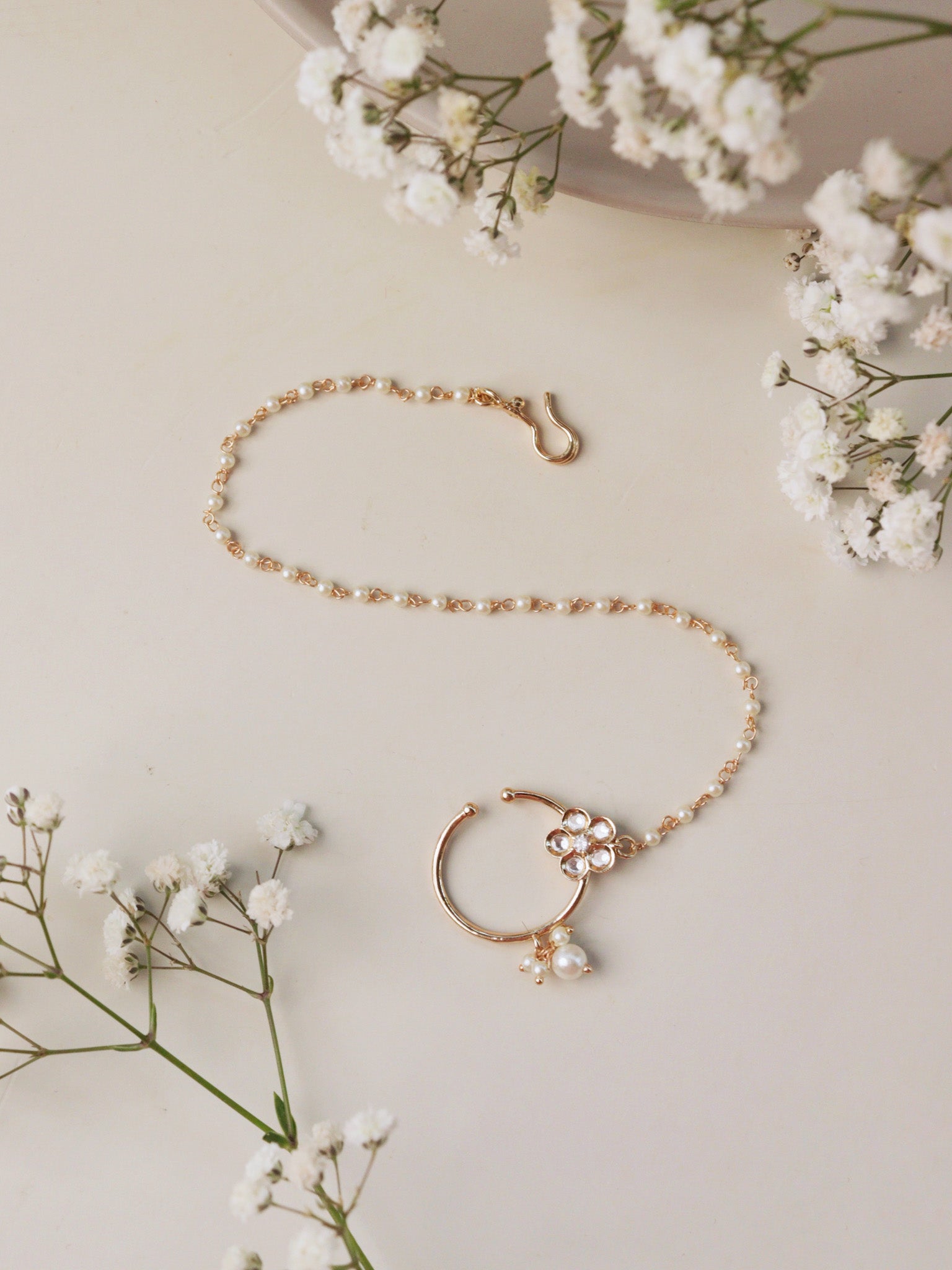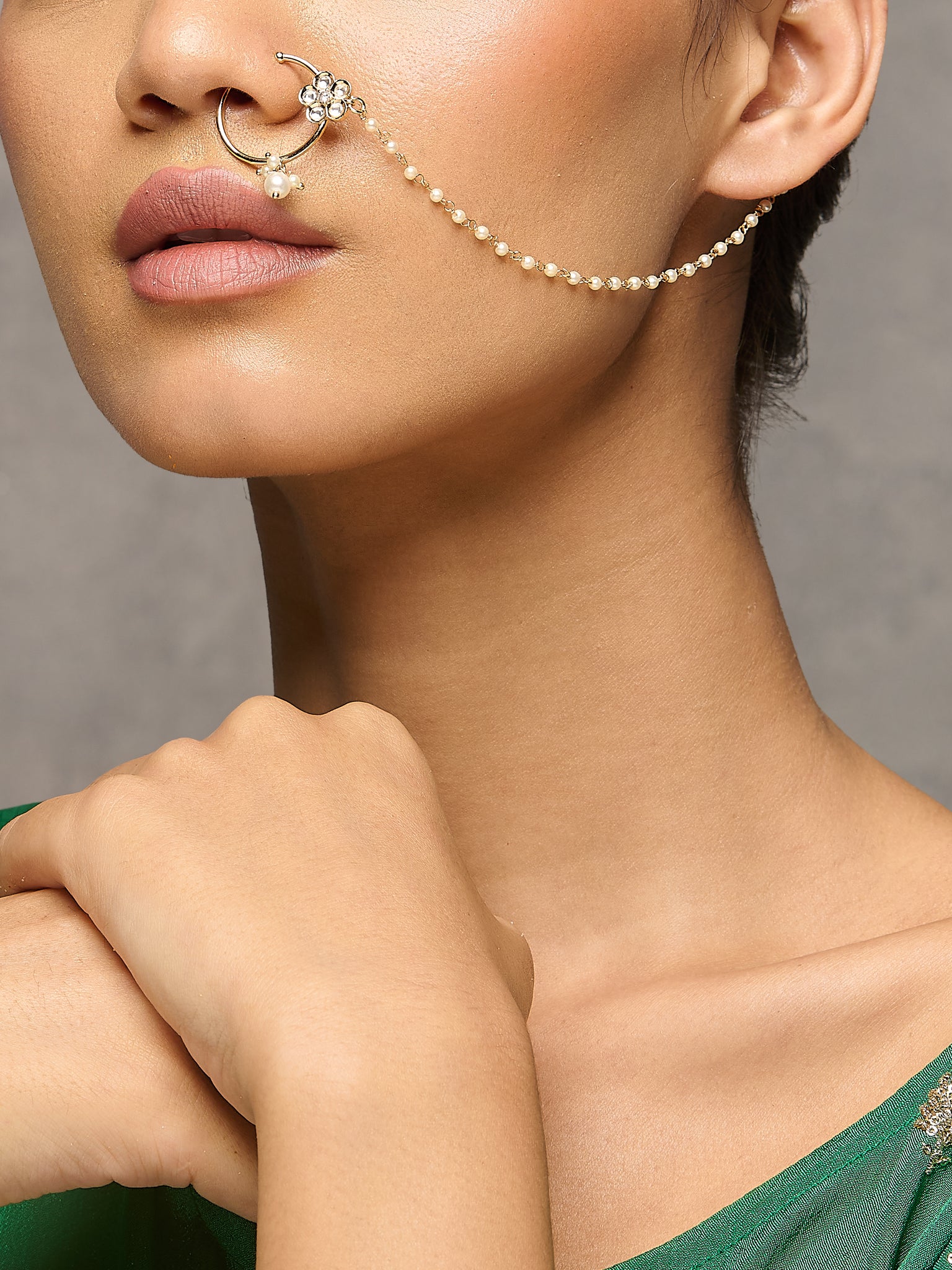Grace meets tradition in the Meiraa Kundan Bloom Nath, a captivating piece that embodies timeless elegance. Meticulously handcrafted with intricate Kundan work, this nose ring features a delicate floral motif that blooms with royal charm. Embellished with lustrous faux pearls, it adds a soft, ethereal glow to the design.