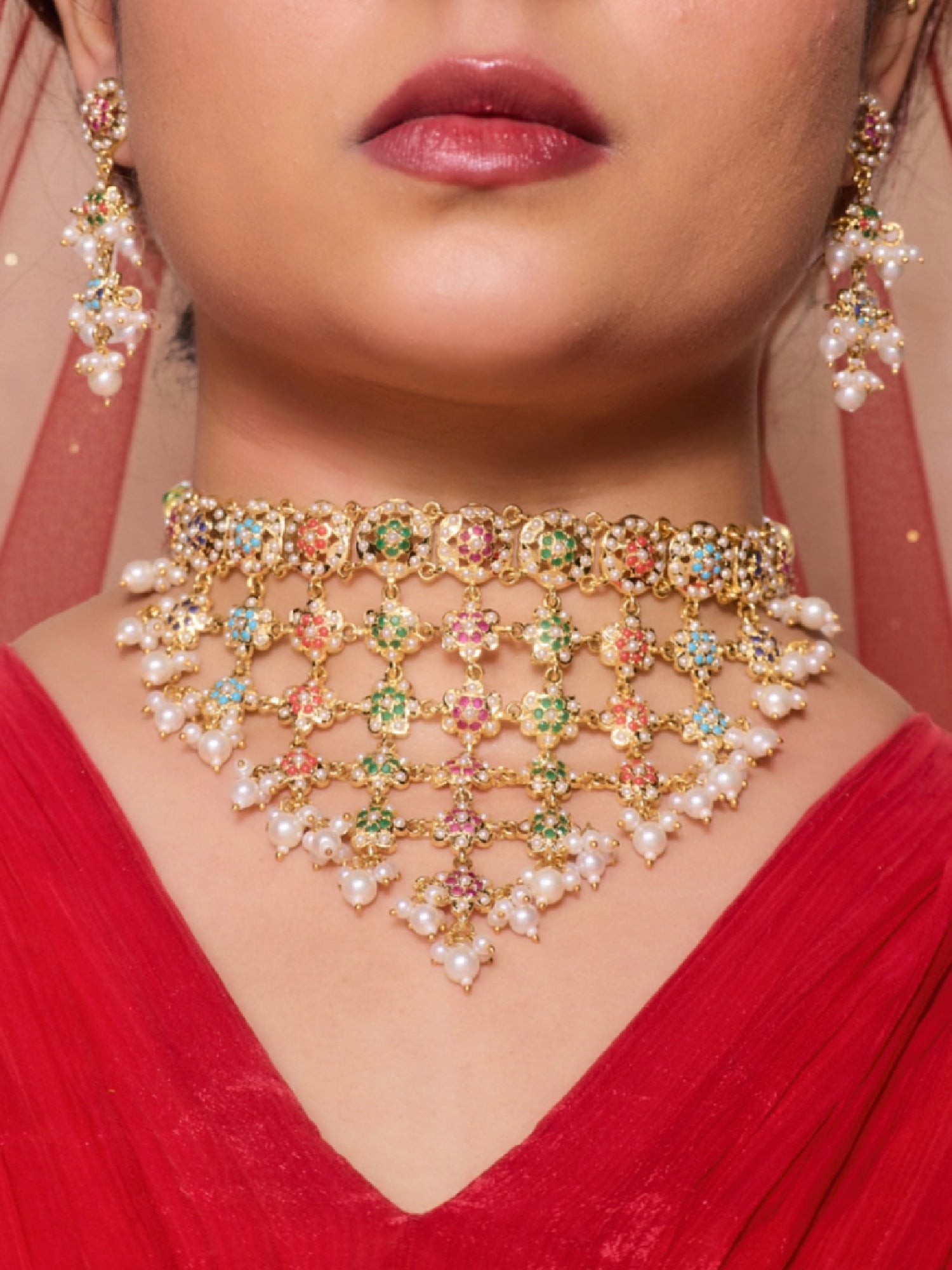 Elevate your bridal and festive look with the Enchanted Multicolour Jadau Necklace Set. Featuring intricate Jadau craftsmanship adorned with vibrant Multicolor gemstones, this necklace set exudes elegance and timeless charm. Perfect for weddings, receptions, and cultural celebrations, its detailed design makes it a standout piece for any special occasion. A must-have addition to your bridal jewellery collection, the Enchanted Multicolour Jadau Necklace Set beautifully complements ethnic, wedding, and festive ensembles.