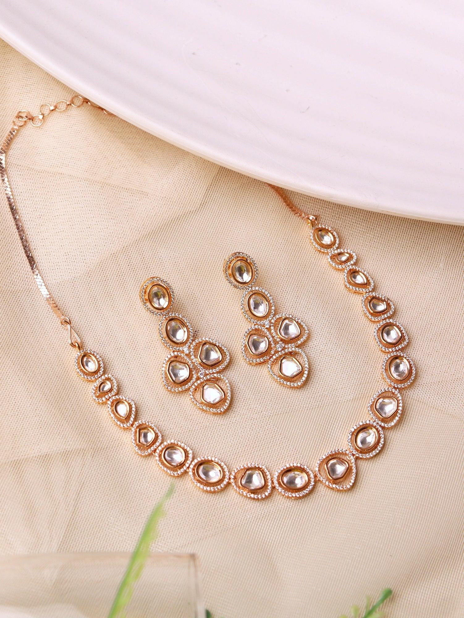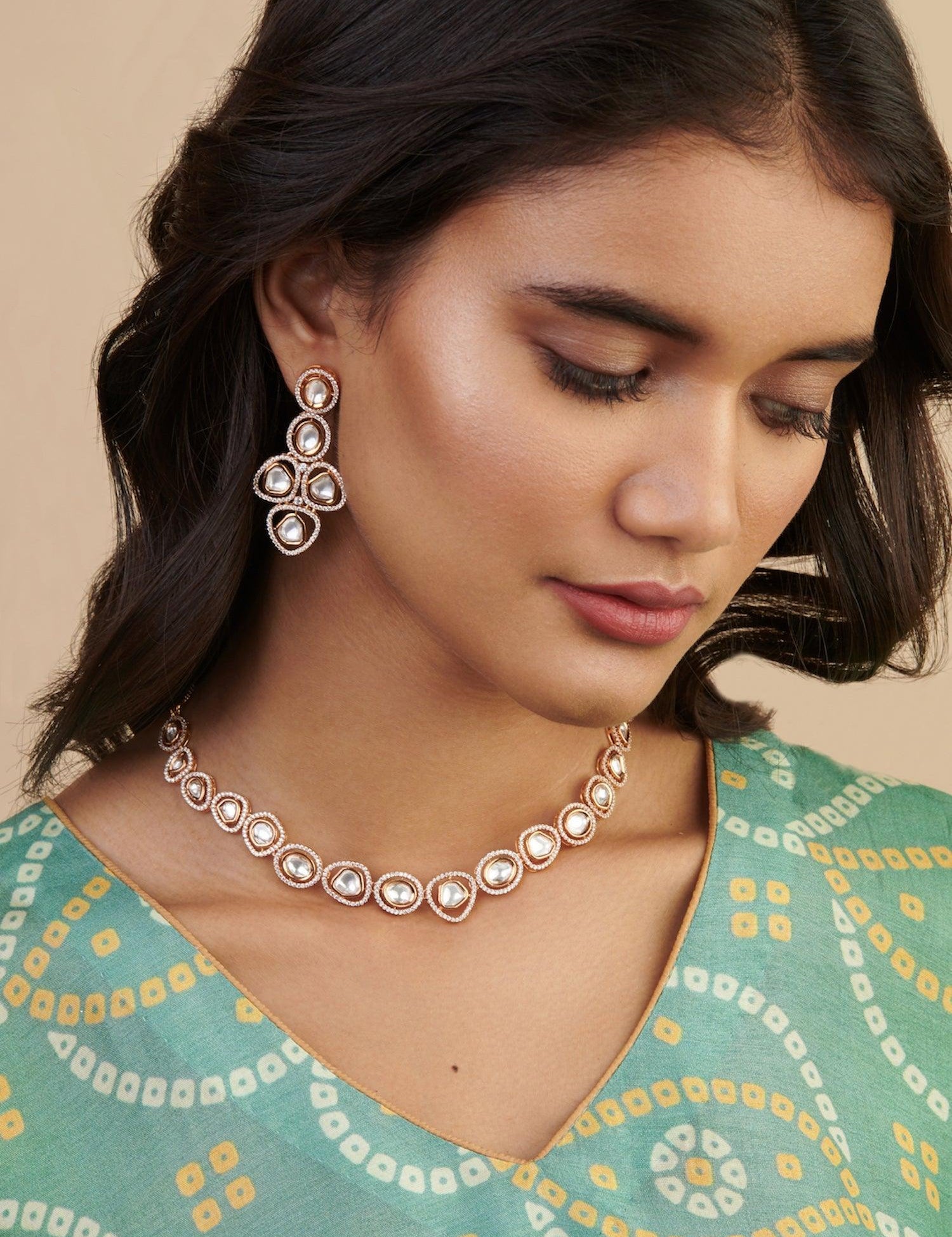 The Meiraa "A String of Kundan Necklace" Set The "A String of Kundan" Necklace Set is a testament to the artistry and skill of the craftsmen who have meticulously handcrafted each piece. The necklace is carefully designed to create a harmonious arrangement of Kundan stones, enhancing their natural beauty and creating a captivating visual effect.
