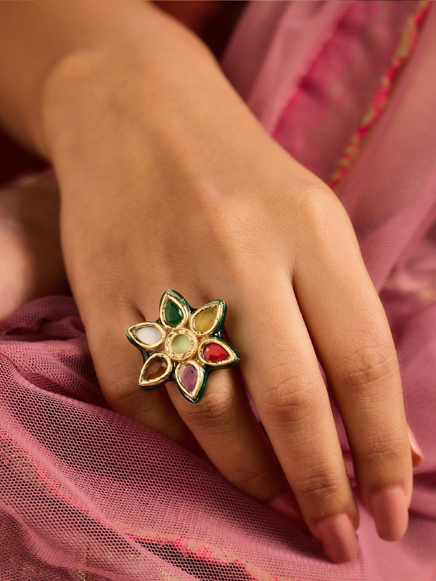 The Navratna Sitara Ring is a radiant expression of timeless beauty and cultural elegance. Featuring nine vibrant gemstones set in intricate craftsmanship, this exquisite ring symbolizes prosperity, balance, and grace. Perfect for brides and fashion jewellery lovers, it pairs beautifully with festive wear, cocktail ensembles, and contemporary ethnic outfits. A must-have addition to your bridal jewellery collection, the Navratna Sitara Ring adds a regal, colourful sparkle to every celebration and special occasion.