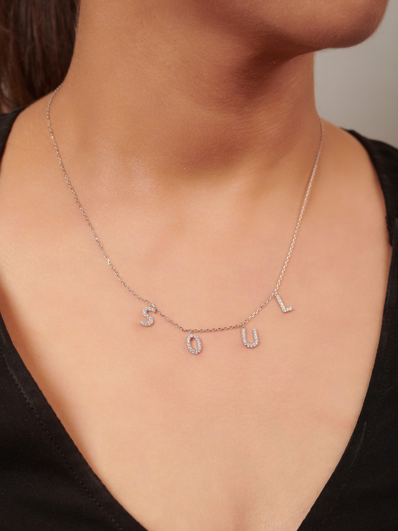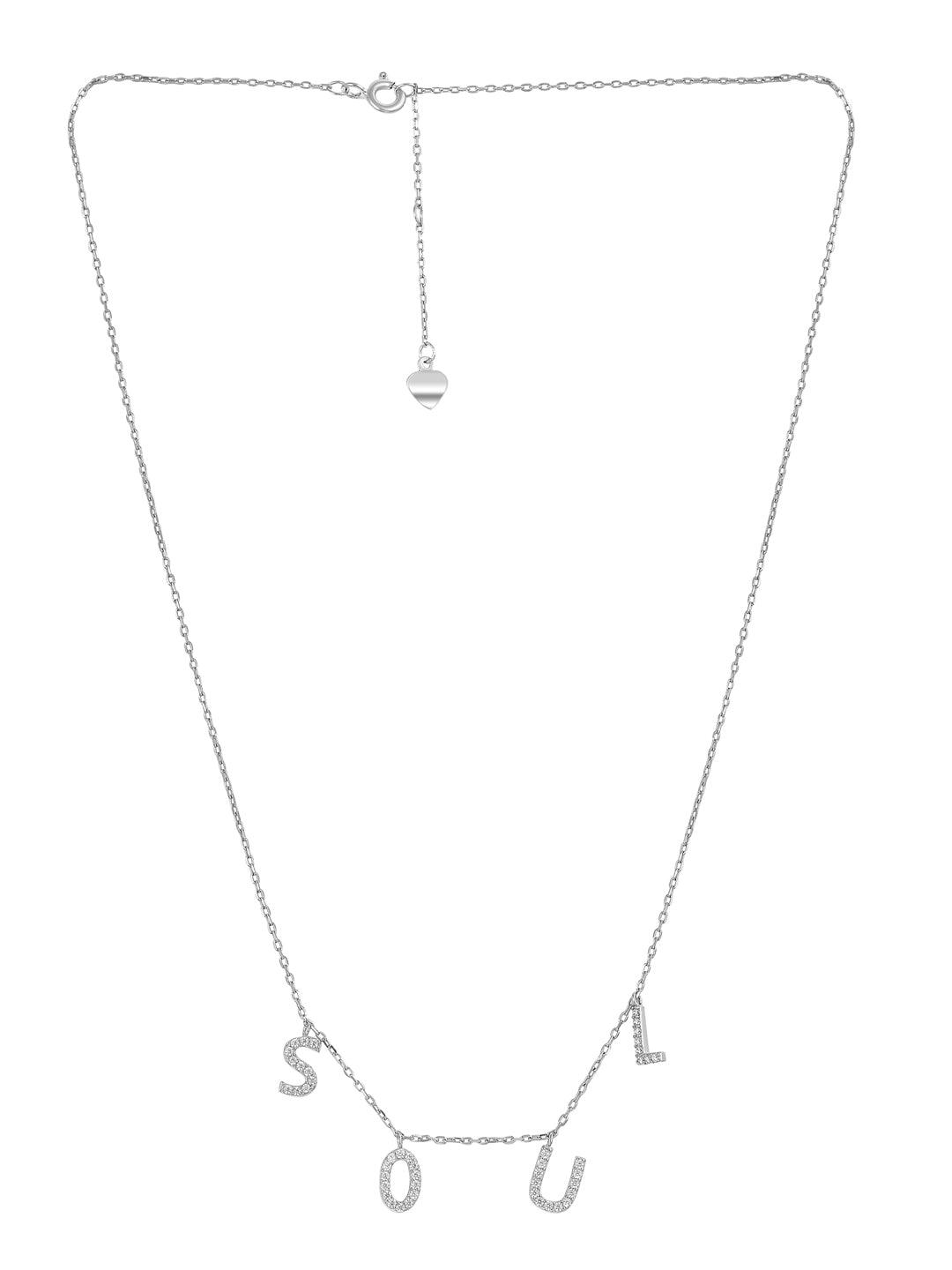 Pure Silver Soul Necklace is handcrafted in pure Silver and plated with rhodium. It's encrusted on pure Silver and detailed with cubic zirconia stones on the alphabets for the gleam. It's a pretty to pair bauble for multi layering.