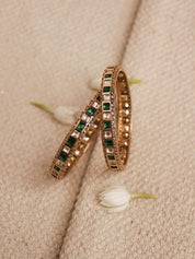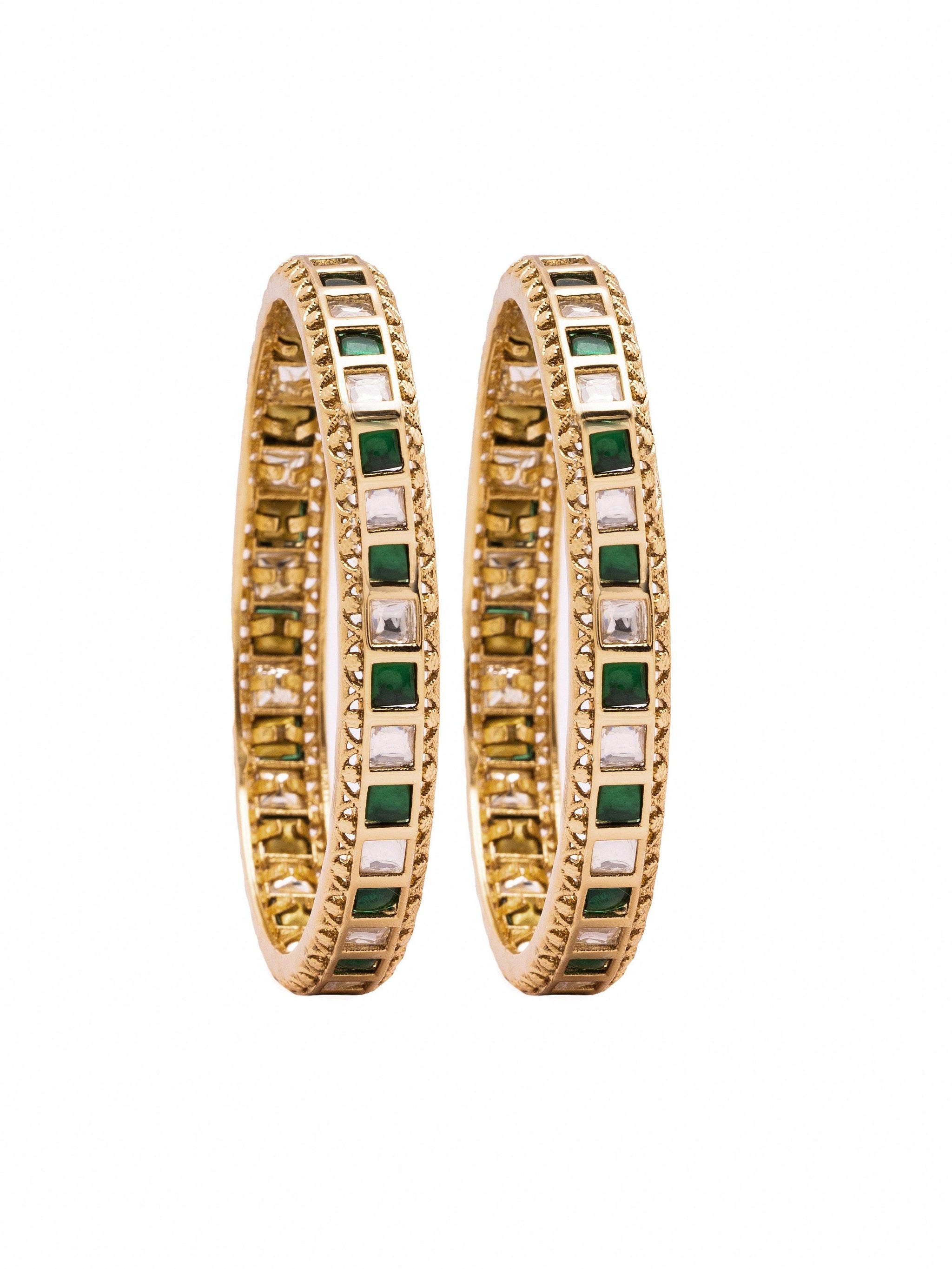 The meticulous craftsmanship ensures that each emerald and Kundan stone is impeccably set, creating a captivating and opulent design that's perfect for special occasions. This bangle seamlessly marries tradition and elegance, making it a versatile choice for both traditional and contemporary ensembles.