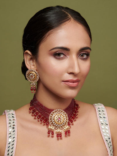 The Bridal Edit - Deep Red Beads Strung Choker Set is beautifully handcrafted on high quality mixed metal alloy, plated with fine gold plating. It is neatly stung in deep red semi precious beads and drops.